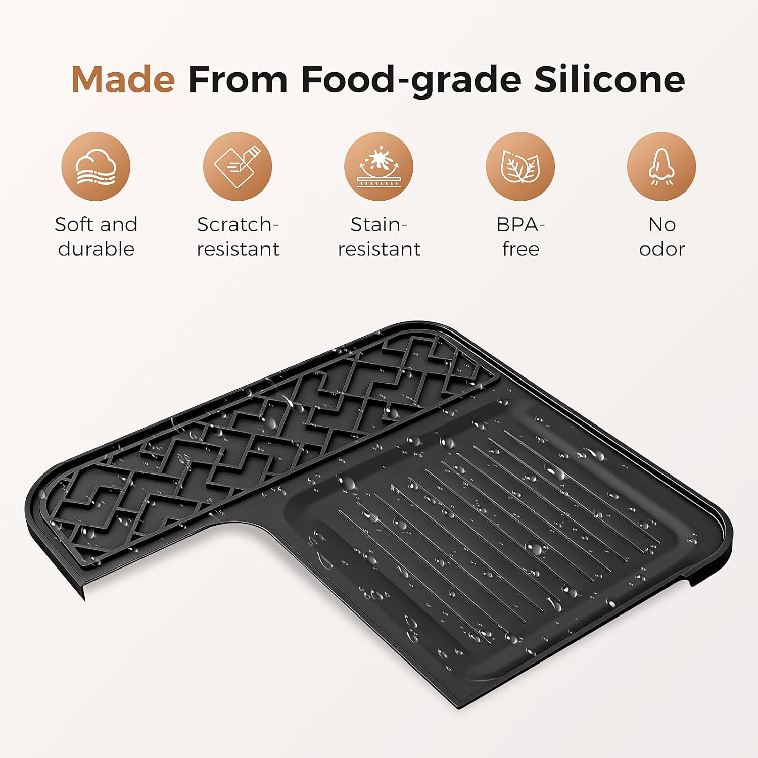 - Resistente al calor: la alfombrilla para cafetera está hecha de silicona de grado alimenticio, ofreciendo propiedades antideslizantes, impermeables y resistentes al calor sin olor. Evita que el agua se filtre por debajo, evitando así manchas en encimeras y protegiendo las superficies de daños.