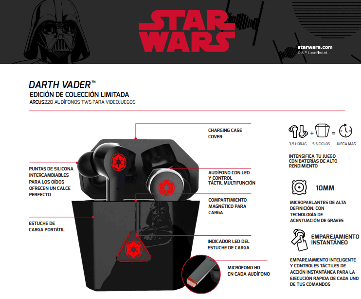 Darth Vader Arcus220 TWS Earbuds Audífonos Inalámbricos Primus Star Wars PWH-S220DV