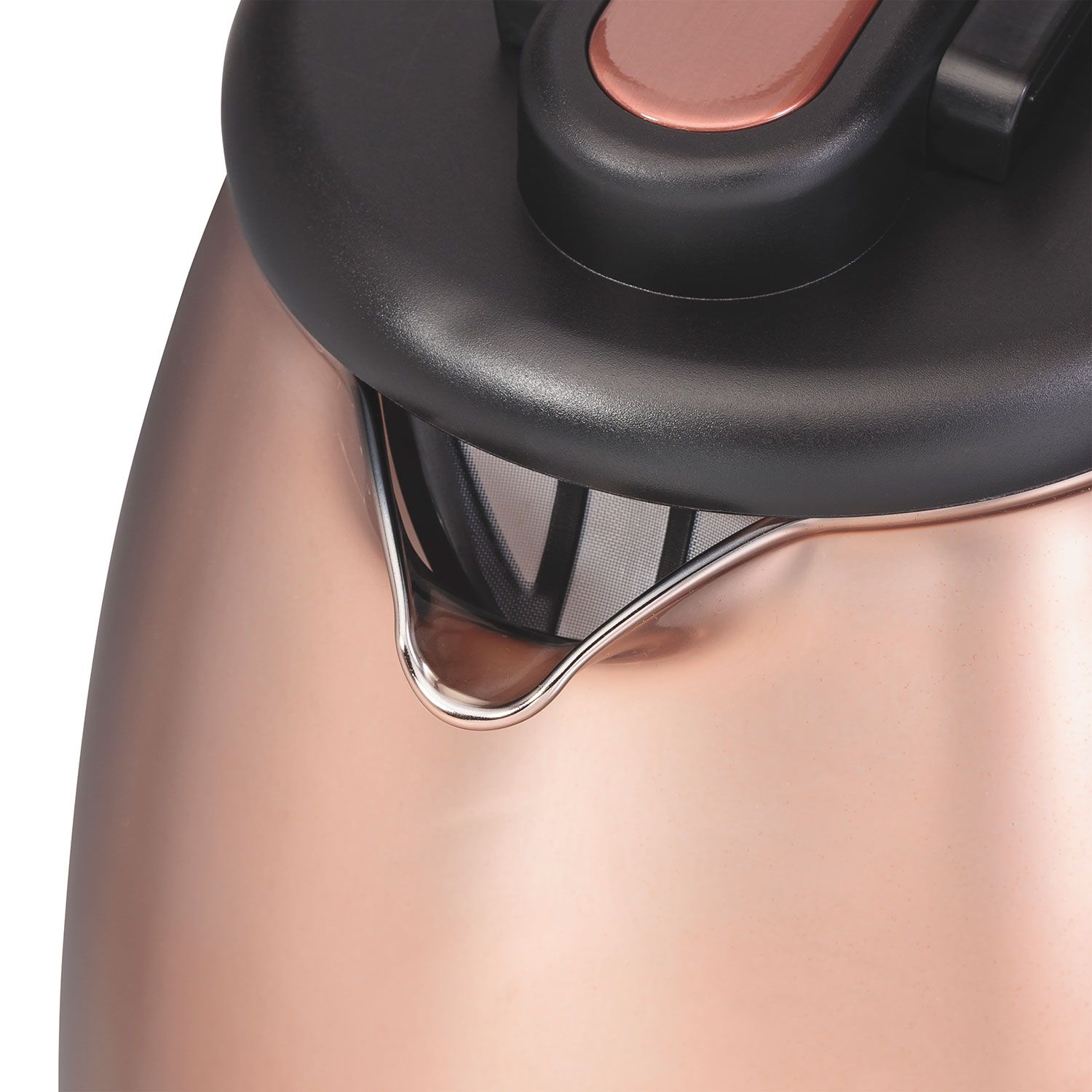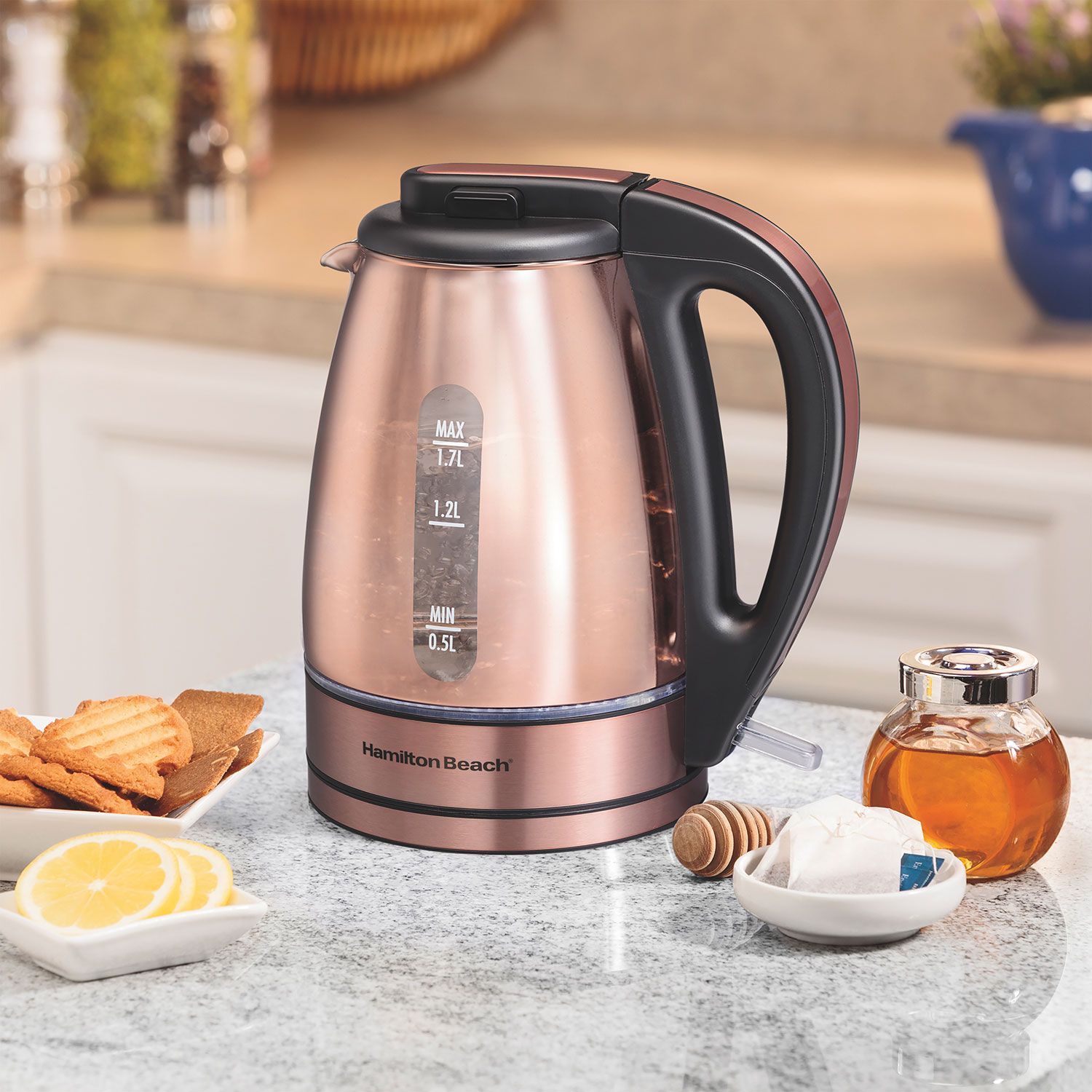 Lleve la apariencia clásica del cobre a su mesa sin el alto precio ni el mantenimiento con la tetera de vidrio Hamilton Beach®. El hermoso acabado de cobre y el servicio sin cable lo hacen perfecto para cualquier ocasión, desde el desayuno entre semana hasta el brunch del domingo. Con una capacidad de 1,7 litros, hay suficiente para todos.