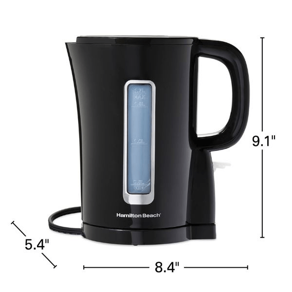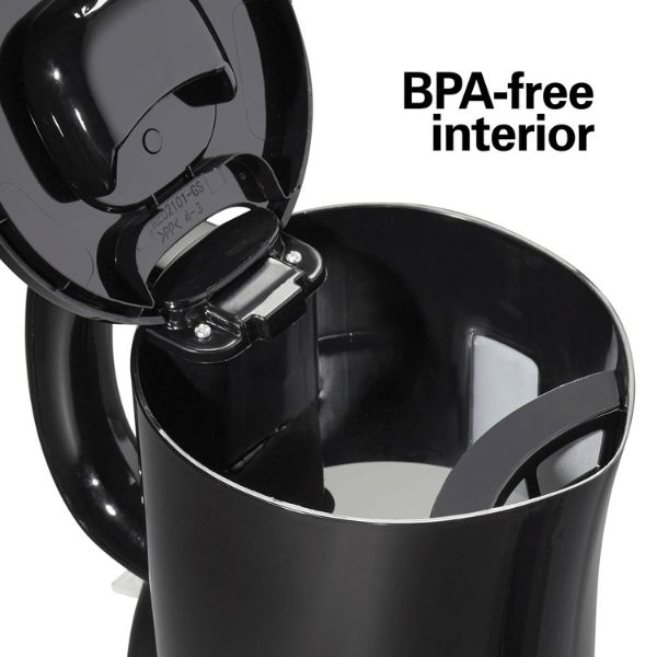 El Hervidor Eléctrico Hamilton Beach 1.7L 41038G es una opción excelente para tu cocina. En primer lugar, su diseño moderno en color negro con un borde metálico le da un toque de elegancia, y además, su interior libre de BPA garantiza un uso seguro.