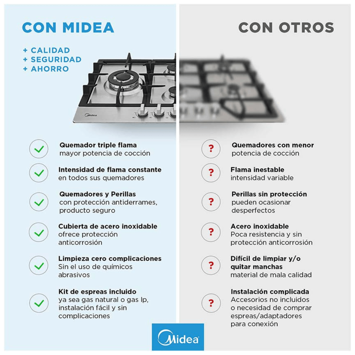 | Protección contra filtraciones | Perillas y quemadores diseñados para evitar derrames |
