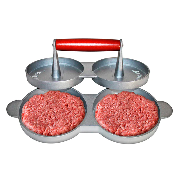Prensa para hamburguesas dobles, le permite hacer 2 tortas (10.25 cm diámetro x 1.50 cm) a la vez de forma rápida y perfecta.