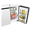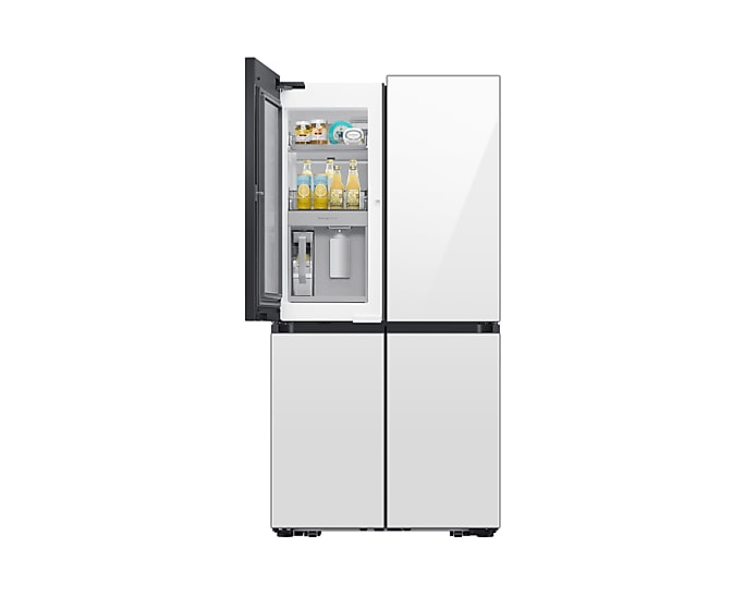 Este modelo presenta un diseño French Door de cuatro puertas con un acabado en color blanco limpio, permitiendo una integración armoniosa en diversos estilos de cocina. Los paneles BESPOKE ofrecen la posibilidad de personalizar el aspecto del refrigerador según las preferencias del usuario, adaptándose a la estética del hogar.