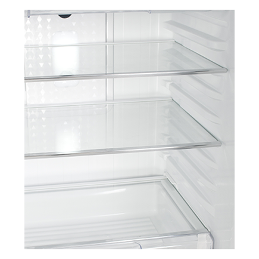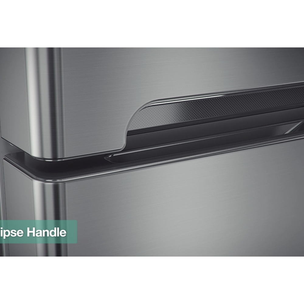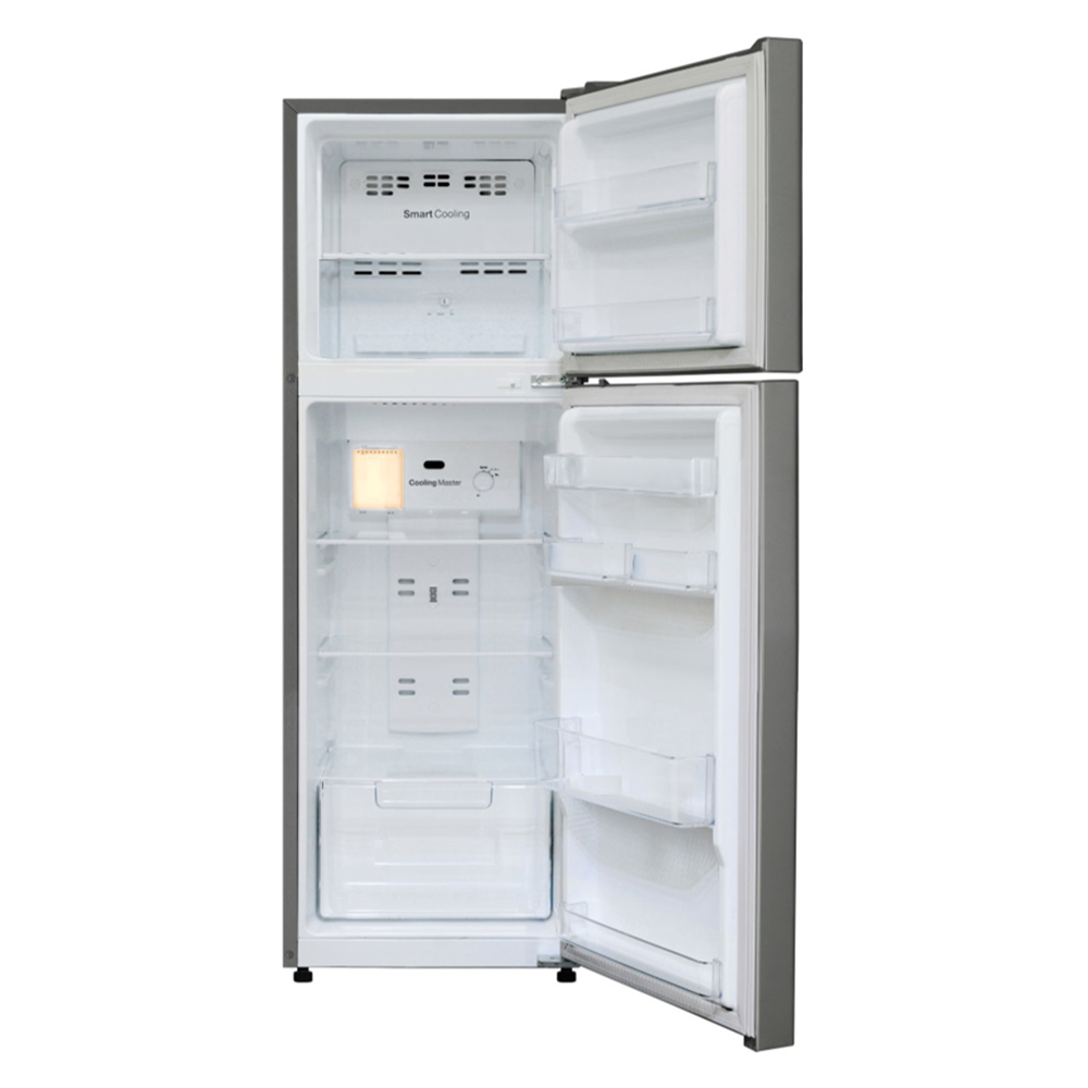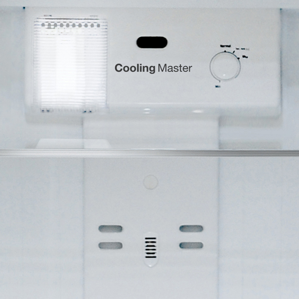 Refrigerador de 322 litros , manija ergonómica, color metal plateado, incluye múltiples características: tecnología Cooling Master, bandejas de vidrio templado, y construido en acero inoxidable.