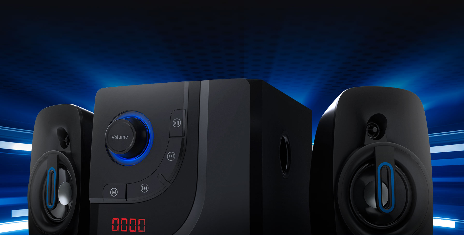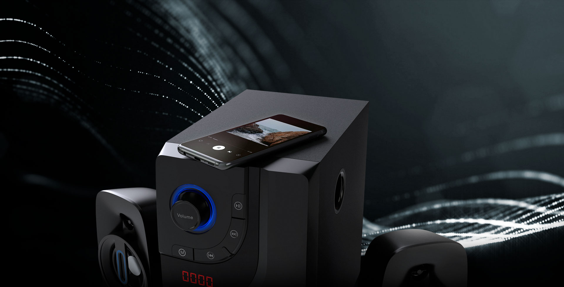 Este sistema de parlantes de 2.1 canales con pantalla digital ofrece una experiencia de sonido inigualable.