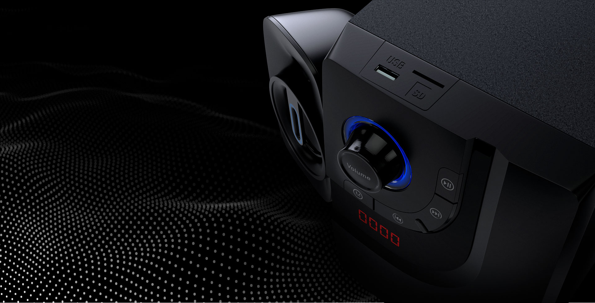 El sistema consta de dos parlantes satélite de 5 vatios para la gama completa de tonos que combina con un potente altavoz de ultragraves de 20 vatios, el cual está dotado con prácticos controles de volumen, bajos y de selección de música en la sección frontal del equipo. Los puertos para memorias USB y SD™ te permiten conectarte a este sistema de la forma que quieras. Este sistema de parlantes de 3 piezas tiene la potencia suficiente para generar un sonido nítido y sin distorsión, transformando los videojuegos, películas y tu música en una experiencia de audio inigualable.